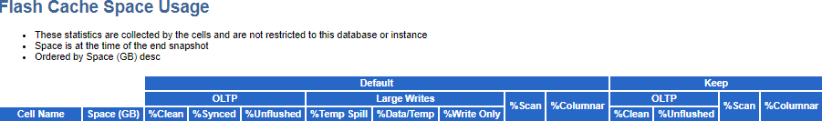 AWR 리포트의 Flash Cache Space Usage 항목은 DBA_HIST_CELL_GLOBAL 테이블의 데이터로 flash cache의 사용량을 비율로 표시합니다.