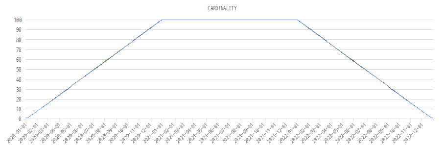 over_days_cardinality = cardinality * ((range_days - over_days) / range_days) = 100 * ((364 - 182) / 364) = 50